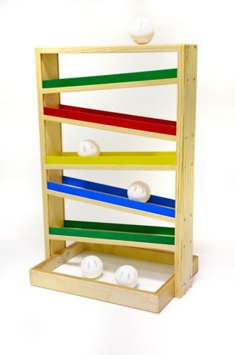 Giant tumble down ball maze with 5 soft, white wiffle balls. The balls are placed through the top, zigzag their way down and are collected in the tray at the bottom for retrieval and continued play. Set of 5 balls included.