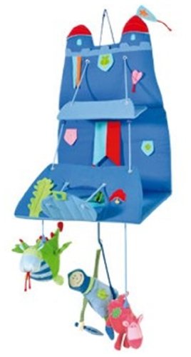 HABA 1123 - As a mobile, Knight Don Rudolf, his horse Rodrigo and the dragon are real eye-catchers. The horse and dragon are attached by magnets and can be detached to cuddle. Figures with squeaker and bell. Serves as shelving for small items(ie. diapers, hairbrush, powder...). Made of cotton/polyester and velour. Dragon measures 10" long.