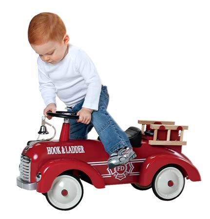 Young firefighters will love to ride around on their very own fire truck. The vibrant red-colored steel body and detailed chrome accents make this ride-on even more authentic. Features a horn, a working steering column, plastic fenders, and rubber tires for real emergency response action| 29.5 inches long.