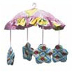 Ruffled umbrella mobile in pink flower print with dangling trellis print flowers, plays Brahms Lullaby.