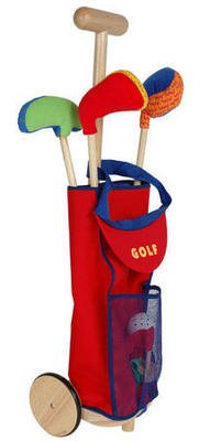 Wooden golf caddy adapted for little ones. The Golf Caddy and Clubs set comes complete with little visor to wear along with ball, a flag and a hole. Designed in France. Recommended for Ages 2+.