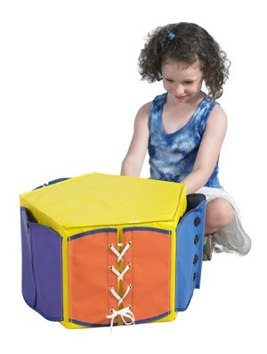 Young children develop their dressing skills with our 5 sided vinyl-covered soft foam pentagon. One side for buckles, snaps, laces, zippers and buttons. Heavy duty, washable pentagon doubles as seat or table. Industrial strength hardware. 11-1/2h pentagon.